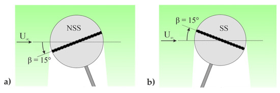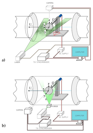 PIV images were captured by an 8 MP digital CCD (Charged Coupled Device) camera. The free-stream was seeded with oil particles by a TSI Incorporated six-jet droplet generator, which produced a typical droplet diameter of 1 μm. The droplets were illuminated using a 120 mJ dual-head Nd:YAG laser that generated a sheet of light approximately 1 mm thick. The time between consecutive laser pulses was set to t = 4 μs. The operation of the laser and camera was controlled using a TSI Model 610034 synchronizer. PIV measurements for the reverse swing experiments were taken in the lateral x-y plane passing through the centroid of the ball (z = 0) with the camera mounted above the working section, directed downwards—see Figure 6a. For experiments in which the ball was not rotating, 500 image pairs were collected at a capture rate of 7.5 Hz, from which a time-average was taken. When backspin was applied, images were phase-locked with the rotational frequency of the ball to ensure that any eccentricity did not affect the time-averaged results. To capture the flow field around both the SS and NSS, the ball could be rotated in both directions about the z-axis (as demonstrated in Figure 7a for the NSS and Figure 7b for the SS). Thus, the camera and laser set-up remained in situ. A wide-angled lens with a 50 mm focal length was used to capture the entire NSS or SS, and a lens with a 100 mm focal length was used to interrogate the area around the point of boundary layer separation on the NSS. The pixel size was approximately 0.06 mm with the 50 mm lens and 0.03 mm with the 100 mm lens. The 50 mm lens was also used for the experiments investigating the Magnus effect, resulting in a pixel size of 0.09 mm. The f-number was set to between f/5.6 and f/8.