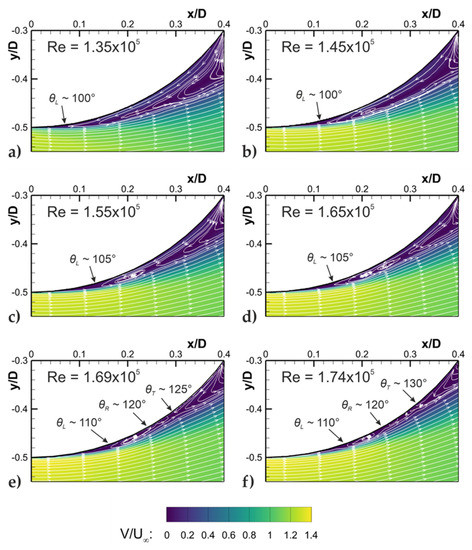 Figure 9 shows a magnified view of the flow field at higher Re, revealing the region of separation on the NSS of a stationary ball. The data is collected over a range of Re specifically near, within, and either side of the critical regime—see Figure 3. At Re = 1.35 × 105 (Figure 9a), laminar separation still occurs at an angle of θL~100°. As Re increases to 1.65 × 105 (Figure 9b–d), there is evidence that a separation bubble forms near the surface, shown by a localized region of recirculation. In addition, the separation point translates downstream. At higher Reynolds numbers (Re = 1.69 × 105 and 1.74 × 105 in Figure 9e,f), the laminar separation bubble reattaches downstream, and a turbulent separation angle can be identified around θT~130°. The Reynolds number at which the separation bubble forms (and the flow enters the critical regime) is similar to that measured by Scobie et al. (2013), identified at the point where the direction of swing switched from CS to RS (see Figure 3). The range of Reynolds numbers shown here corroborates with the critical regime for a sphere with a surface roughness of k/d = 250 × 10−5.