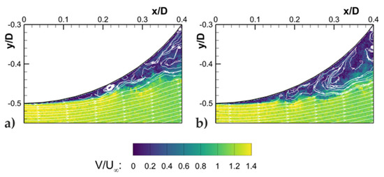 The laminar separation bubble can be highly unsteady around the critical Reynolds number, as demonstrated by Deshpande et al. [15]. Figure 10 shows two velocity “snapshots” at the same Re. Figure 10a clearly shows the formation of the bubble, and a corresponding smaller wake, whereas Figure 10b shows that the flow has separated earlier, with a corresponding larger wake. This illustrates the unsteadiness of the LSB, when operating close to the interface of the subcritical and critical flow regimes.