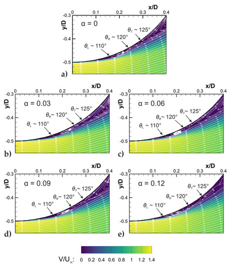 Time-averaged velocity magnitude and streamlines at Re = 1.69 × 105 on the NSS for different spin rates, α (equivalent bowling speed of 78 mph). Separation and reattachment angles shown to nearest 5°.