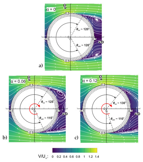 Time-averaged velocity magnitude in the x-z plane at Re = 1.94 × 105 (U∞ = 20 m/s) showing (a) the symmetric flow field with no rotation and (b,c), the Magnus effect demonstrated at two different spin rates. Separation angles shown to nearest 5°.