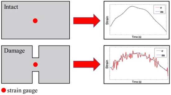 In this study, the proposed damage identification approach was investigated experimentally and numerically. In Figure 1, a schematic of the approach, “e” and “m” denote the expanded strain and measured strain. When the structure is intact, the calculated expanded strain is equal to the measured strain at the same location. However, when the structure is damaged, the expanded strain differs from the measured strain at the same position. This study used these differences to identify damage and employed the degree of difference to determine damage severity.