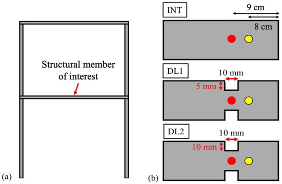 An acrylic rigid frame with beam elements consisting of 20,760 elements and 20,767 nodes was modeled in the commercial finite element software Abaqus. For the purpose of validation, we assumed nearly identical, to our best, geometric and material properties between the numerical model and experimental setup. A geometric model of the frame (Figure 2a) included six 400 mm × 50 mm × 5 mm acrylic slats fastened with stainless steel joints. The bottom of the frame was assumed fixed. The material properties of the acrylic and stainless steel included the following: Young’s modulus E = 2.74 and 200 GPa, mass density = 1190 and 7930 kg/m3, and Poisson’s ratio = 0.32 and 0.247. To emulate the scenarios of damage and no damage, the horizontal middle section was categorized into three types of slats (Figure 2b), namely intact (INT), mildly (DL1) and severely (DL2) damaged structures, indicated by no cracks and cracks of 5 mm and 10 mm in depth, respectively.