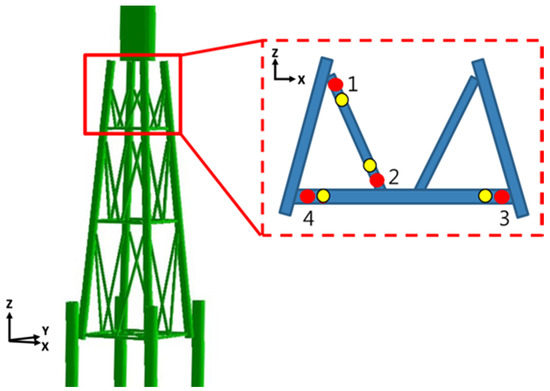 Jacket support structure numerical model (yellow and red points are measured and expanded points, respectively).