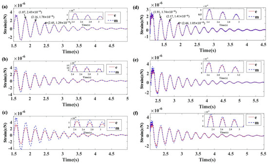 Numerical results of (a) INT (intact), (b) DL1 (mildly damaged), and (c) DL2 (severely damaged); experimental results of (d) INT, (e) DL1, and (f) DL2; “e” and “m” denote expanded and measured strains.