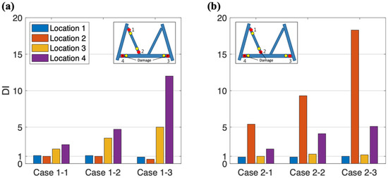 The results in Figure 5 and Figure 6 were in excellent agreement with the conditions presented in Table 2. When the severity of the damage was increased (from Case 1-1 to Case 1-3), the at Locations 3 and 4 increased from 2 and 3.5 to 5 and 12 (Figure 5a), respectively. In Figure 5b, Case 2, representing multiple instances of damage in different pipes, also demonstrated the same trend as for Case 1. Furthermore, the values in locations with minor damage were at least 100% greater than the value in the undamaged section (Cases 1-1 and 2-1). Likewise, the values in locations with moderate and severe damage were at least 250% and 900% larger, respectively, than those in undamaged sections (Cases 1-2, 1-3, 2-2, and 2-3). The results indicated that the proposed approach can effectively identify damage severity in multiple damage sites irrespective of the pipe in which damage occurs. Two extremely high values (>10) were obtained in Cases 1-3 and 2-3 (the cause of extremely high values discussed in Section 3.1.3.); therefore, an extremely large could be only obtained in numerical calculations.
