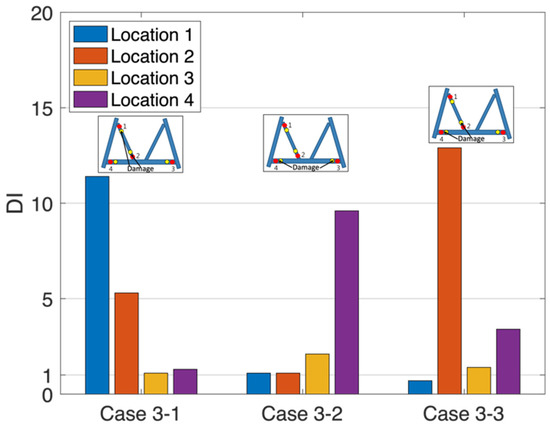 We employed three cases (the calculated was determined by the data set recorded within eleven seconds) to investigate damage identification in multiple locations. In Case 1, damage occurred at Locations 3 and 4, which were on the same pipe. In Case 2, damage occurred at Locations 2 and 4, which were on different pipes. In Case 3, damage occurred in different pipes to differing degrees. The numerical results of Cases 1 and 2 and Case 3 are presented in Figure 5 and Figure 6, respectively.