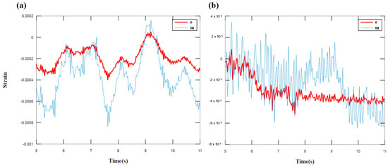 Simulation results of Case 3-1 at Location 1 under (a) wind loading and (b) wave loading; e and m denote expanded and measured strains, respectively. We eliminated the first 5 s of simulation results, which were calculated as the preloading step.