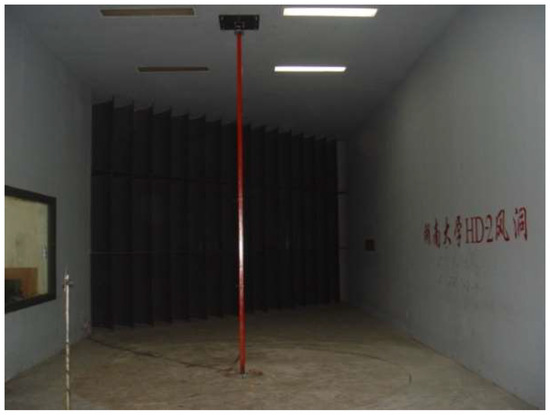 All the tests were performed in a closed-circuit wind tunnel at Hunan University, China. One of the test sections in which the 3D prototype prism tests were performed had a width of 5.5 m, a height of 4.5 m, and a maximum wind velocity up to 16 m/s. The other test section had smaller cross-sections with a width of 3.0 m, a height of 2.5 m, and a higher wind velocity up to 58 m/s. The 2D section model tests were conducted in the smaller test section. All the tests were designed to perform smooth flow conditions.