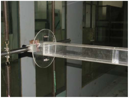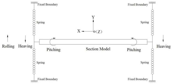 The experimental setup of the 1:1 2D section model, which was made of organic glass (a type of polymethylmethacrylate) material, is shown in Figure 3. The 2D rigid section model adapts eight springs and two circular endplates (diameter = 210 mm) at both ends to guarantee the 2D flow conditions around the model. The section model system has six possible degrees of freedom (DOFs), as shown in Figure 4. There are three translational DOFs and three rotational DOFs, along with X-X, Y-Y, and Z-Z axes, respectively. The translational DOFs in the directions of the X-X and Z-Z axes were restricted in the section modal system, as was the rotational DOF in the direction of the Y-Y axis. The other three available DOFs of the section model system were the translational DOFs in the directions of the Y-Y axis (heaving mode) and Z-Z axis (rolling mode), respectively, as well as the rotational DOF in the direction of the X-X axis (pitching mode).