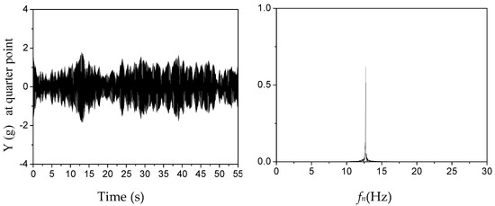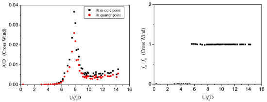 Figure 5 and Figure 6 exhibit the time series of crosswind responses and the corresponding power spectral density (PSD) at the middle and quarter points of the 3D prototype prism, respectively. It can be observed in Figure 6 that the crosswind oscillations of the 3D prototype prism are dominated by the fundamental mode at 12.89 Hz without contributions from higher modes. The experimentally measured curves of dimensionless amplitude responses (A/D) versus normalized wind velocity (U/f0D) and dominating frequency curves are illustrated in Figure 7. VIV lock-in is clearly observed, and the wind velocity for the peak of lock-in is 8.3 m/s. Experimentally, the measured dimensionless amplitude (A/D) responses at the middle and quarter spans of the prototype prism were respectively obtained and were equal to 0.036 and 0.026, with a ratio of 1.38.
