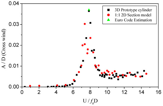 VIV amplitude estimations of the 3D prototype prism and the 2D section model were conducted for comparison with the measured experimental results according to the empirical formula proposed in the Euro Code [27]. The estimation method focuses on slender structures with a typical cross-section (rectangular cross-section is one of them) and is established on a large amount of experimental and field test data. The formula used to estimate the VIV amplitude is: