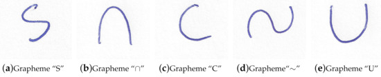 Simple graphemes were recently reported in Reference [15]. This repository contains five types of simple graphemes: “S”, “∩”, “C”, “∼” and “U”, for 50 writers, with 100 samples of each simple grapheme per writer. The images are 24-bit color, pixels in size, with a scanner resolution of 1200 dpi. Figure 1 shows sample images of the simple graphemes contained in the image repository.