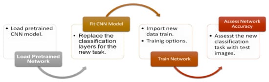 There are CNNs previously trained for image classification that have learned to extract characteristics and information from the images, thus using them as a starting point to learn a new task. Most of these CNNs were trained using the ImageNet database [28], which is used in the ImageNet Large Scale Visual Recognition Challenge (ILSVRC) [29]. The three main uses of pre-trained CNNs are shown in Table 1.