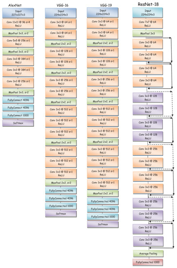 General architecture of AlexNet, VGG-16, VGG-19 and ResNet-18.