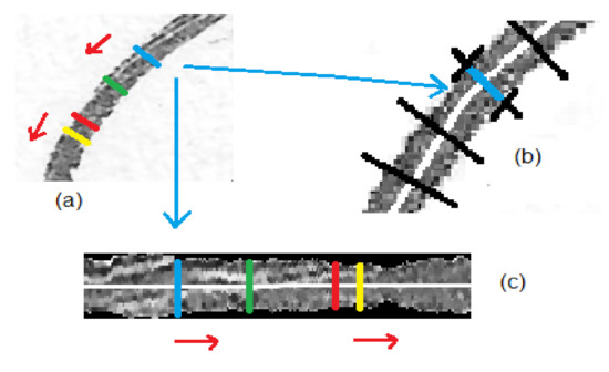 - Obtain the lines perpendicular to the morphological skeleton (black lines in Figure 5b).