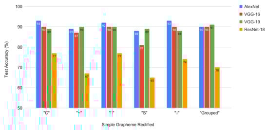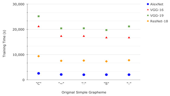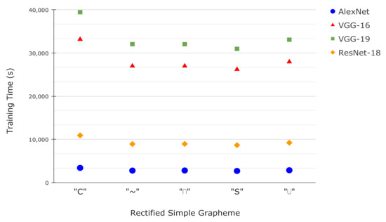 Figure 8 shows the network training times for each rectified grapheme. The AlexNet and VGG16/VGG19 networks of similar architecture, as is known, the execution time increases as the depth of the network increases (epochs = 80). For ResNet-18, despite having trained with a greater number of epochs (epochs = 100) and being similar in depth to the VGGs, the training time is much less similar to that of AlexNet, which is due to the fact that it trains significantly fewer parameters than the other networks.