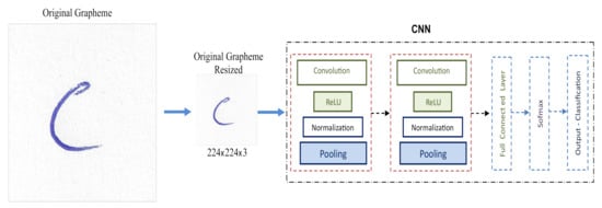 In order not to carry out the procedure of calculating the rectified grapheme and thus avoid this stage of the study process of the original graphemes, experiments are carried out with the RGB image of the original grapheme. The original image should be resized to match the size of the input image for each network, as the original dimension of the graphemes is about 800 × 800 × 3. For AlexNet it resizes to (227 × 227 × 3) and for VGG/ResNet to (224 × 224 × 3). This is illustrated in Figure 9.