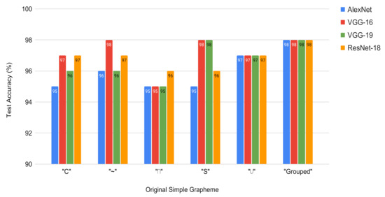 Figure 10 shows the test accuracy of applying the pre-trained CNNs to the original simple graphemes. It is observed that all the used networks achieve good results, being the VGG-16 the one with the best performance.
