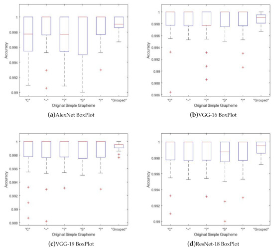 Figure 11 shows the boxplots of the test set classification for all the networks used, in order to show the classification distribution of each grapheme by person. It is observed that the standard deviation of the classification results is very low for all networks, that the central tendency is high, and that there is very little presence of outliers. In particular, it is observed that the AlexNet network is the one with the greatest deviation. From these figures, it is possible to conclude a correct training and an adequate generalization (classification of the Test set).