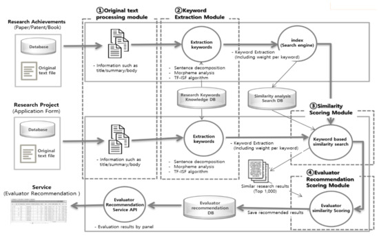 The collection of data on the research achievements of the evaluator candidates is conducted using a method similar to that of the project application data collection. The data from the original text files, primarily in hwp, doc, and pdf format, are extracted in the same manner in the text processing module, and the keyword extraction module is indexed in the search engine for comparative analysis with the project application data. Unlike in the case of project applications, the data on the research achievements of the evaluator candidate are collected regularly, and preliminary indexing reflects changes only in the modified copies through daily placement. The system in its early phase requires the initial indexing of all researchers. As the data on all researchers cannot be complete, priority is placed on key evaluators whose problems due to omitted data can be minimized.