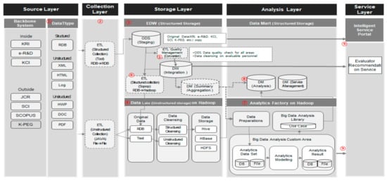 The steps to build a big data platform architecture are shown in Figure 2, and the details are as follows. ① The types of data to be collected from the legacy system are analyzed and their volumes are checked ② Collect first-time raw data into the big data platform, which involves cases such as structured→structured, structured→unstructured, and unstructured→unstructured. ③ The collected data are then structured and stored as data that cover services and data identity. ④ Collected data, which serve as the basic data for analysis, are stored in a data lake, regardless of type. ⑤ The structured data are transformed, and quality management for the raw data of the Operational Data Store (ODS) is performed. ⑥ The analysis of the structured data is performed by Sqoop. ⑦ A Hadoop data analyst performs the unstructured analysis. ⑧ To meet the objective of data storage for user services, data are stored as structured data. ⑨ Services, such as evaluator recommendations, are performed based on the results of the analysis of the raw data and big data of the legacy system.