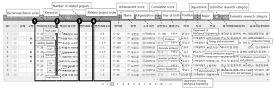 The big data evaluator recommendation system planned an ontology that could store and infer various information in the knowledge database to improve recommendation quality, but the ontology could not be implemented in the actual implementation stage. In this study, we saved the knowledge database in the form of a keyword-attribute-value triple in the RDB. Through this data base, the direction of the ontology composition was examined, and the main keywords were stored here to be used as basic data for improving the quality of future evaluator recommendations. Figure 3 shows the output of the big data evaluation recommendation system. ① The “Big Data Recommendation Level” indicates the recommendation for the final evaluator candidates that have undergone pretreatment and analysis according to the abovementioned big data platform architecture. ② The major keywords of the evaluator candidate recommenders are shown in one single view. ③ The numbers of connected projects are identified, indicating how many projects of each evaluator candidate recommender relates to the specific panel. ④ The shown sequence maps the evaluator candidate recommenders and related projects.