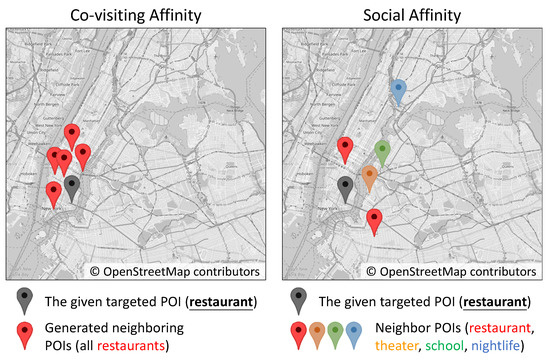 Figure 1, in which different colors mean various venue categories. We can find that the random walk by co-visiting affinity tends to collect neighbors with the same category as the target POI. The random walk by social affinity has a higher potential to bring neighbors with diverse venue categories. Hence, we would like to have both effects so that the representation learning can generate similar embeddings that not only encode similar categories but also distinguish from each other due to different social interests.
