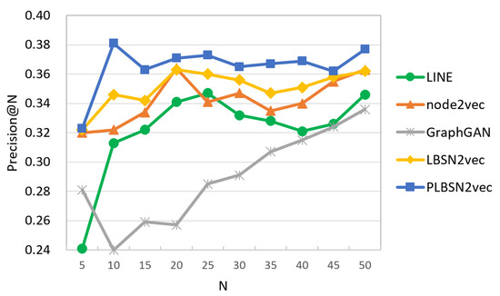 N gets increased, PLBSN2vec is able to stably have the higher Precision values. Among the competing methods, we find that GraphGAN has the worst performance, as it cannot capture the contagion between users and POIs. We think our methods lead to better performance because two key factors are considered. One is the modeling of user–user contagion, and the other is user-POI visiting preference. Such two factors can be better modeled into the embedding vectors of our proposed LBSN2vec and PLBSN2vec.