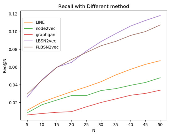 N. We can see the Recall values with different embedding methods. Our LBSN2vec and PLBSN2vec are able to significantly outperform the other network embedding methods. We think the superiority of our methods comes from the derived embedding space that better utilizes the information between user–user interactions and user-POI visiting records in location-based social networks, which is crucial in modeling the potential of future POI visiting.