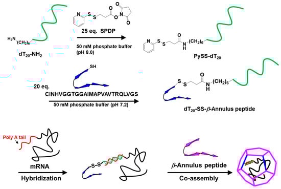 Schematic of synthesis of dT20 modified β-annulus peptide (dT20-SS-β-annulus) and formation of an artificial viral capsid by co-assembly of β-annulus peptide and dT20-SS-β-annulus hybridized with mRNA.