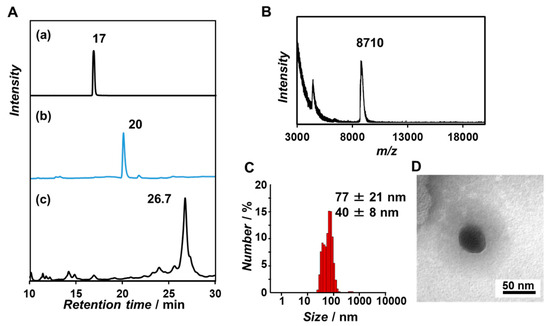 (A) Reverse-phase HPLC chart of (a) dT20-NH2, (b) PySS-dT20 detected at 260 nm, eluted with a linear gradient of CH3CN/0.1 M NH4HCO2 aq (0/100 to 100/0 over 95 min), and (c) dT20-SS-β-annulus detected at 260 nm, eluted with a linear gradient of CH3CN/0.1 M NH4HCO2 aq (10/90 to 100/0 over 95 min). (B) MALDI-TOF-MS of the purified dT20-SS-β-annulus (matrix: 3-HPA). (C,D) TEM image and size distribution obtained from dynamic light scattering (DLS) for an aqueous solution of 50 µM dT20-SS-β-annulus in PBS (pH 7.4) at 25 °C.