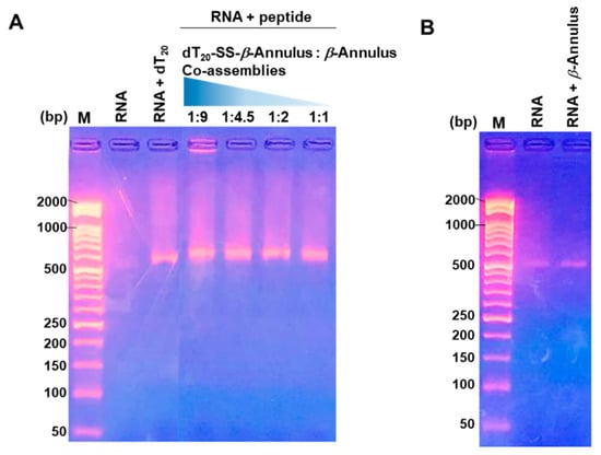 Gel shift assay of (A) co-assembly peptides hybridized with mCherry mRNA, (B) mixture of β-annulus peptide and mCherry mRNA in phosphate buffered saline (PBS) (pH 7.4) incubated at 25 °C for 30 min. M: DNA marker. All DNA markers used in the gel shift assay are the same. The gels were stained with GelRed.