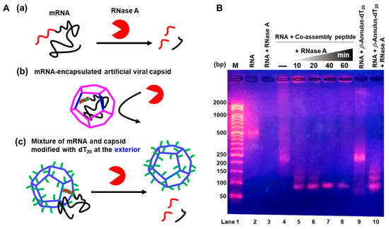 (A) Illustration of digestion of mRNA by RNase A: (a) mRNA alone, (b) mRNA-encapsulated artificial viral capsid, and (c) Mixture of mRNA and capsid modified with dT20 at the exterior. (B) Gel electrophoresis assay of digestions mRNA by RNase A at 37 °C for 10 min (mRNA alone and β-annulus-dT20) and 10–60 min (dT20-SS-β-annulus:β-annulus = 1:9 co-assembly). The gel was stained with GelRed.