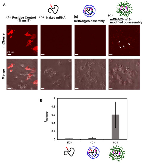 Uptake of mCherry mRNA-encapsulated capsids into human hepatoma HepG2 cells were analyzed by CLSM to evaluate mCherry mRNA expression inside cells. mCherry mRNA and a strong transfection reagent (TransIT-mRNA) were incubated with the cells for 48 h at 37 °C as a positive control; significant red fluorescence of mCherry was observed (Figure 7(Aa)). Unfortunately, minimal expression of encapsulated mCherry mRNA was observed as similar to the naked mCherry mRNA(Figure 7A(b,c)). We employed a histidine 16-mer (His16), a cell-penetrating peptide uncharged under physiological conditions [36,37] to enhance cell permeability of capsids. We constructed artificial viral capsids modified with His16 on the exterior and using the 1:9 co-assembly of dT20-SS-β-annulus peptide and β-annulus peptide modified with His16 at the C-terminal (β-annulus-His16). Significant red fluorescence of mCherry was observed in cells incubated with His16-modified capsids (Figure 7(Ad)). The expression level of mCherry was quantified by fluorescence intensity in the cell areas of the CLSM image using the software ImageJ. The expression level using His16-modified capsids was 26.5 times the expression observed with unmodified capsids (Figure 7B). This indicates that the intracellular expression of mCherry was significantly enhanced by the modification of His16 on the surface of the artificial viral capsid. We have demonstrated in our previous work that the reductive cleavage of the disulfide bond of the artificial viral capsid by dithiothreitol (DTT) caused the controlled-release of ssDNA with the destruction of the capsid [35]. mCherry mRNA was likely released from capsids in the reducing environment in cells.