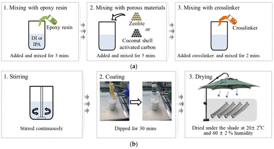 Figure 2 shows the coating method of zeolite or coconut shell activated carbon and the epoxy on the textile fibers. The considerably high viscosity of epoxy results in a high possibility of forming entangled lumps with the zeolite or coconut shell activated carbon powder [18]. Hence, to reduce the formation of entangled lumps, the epoxy needs to be diluted to a high-flow solution [19]. As shown in Figure 2, the deionized water or isopropyl alcohol for dilution was mixed with the epoxy resin for 3 min. Subsequently, the zeolite or coconut shell activated carbon powder was added and mixed for 5 min. The epoxy hardener was finally added and mixed for 2 min. The textile fibers were fully dipped into the combined dilution solution and stirred continuously. The dipping time was 30 min. The dipped textile fibers were dried under a shade at 20 ± 2 °C and 60% ± 2% humidity.