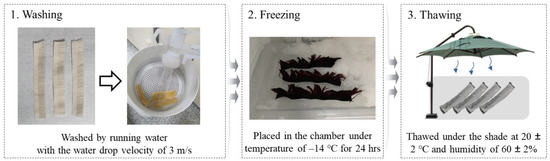 Figure 3 shows the washing and freeze–thawing process of the textile fibers coated with porous materials. In the washing process, the textile fibers coated with porous materials were washed by running water with the water drop velocity of 3 m/s, which is the maximum water velocity in rain. In the freeze thawing process, the textile fibers were placed in a chamber with a temperature below −14 °C for 24 h after washing, and then thawed under the shade at 20 ± 2 °C and 60% ± 2% humidity. Before testing, the processed textile fibers were dried under the shade.
