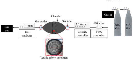 Figure 5 shows the measurement machine for the removal of SOx and NOx by the textile fabrics coated with the porous materials. The measurement machine was composed of a chamber, a velocity and flow controller, a gas inlet and outlet, and a gas analyzer. The chamber had shape of a rugby ball with a 90 mm inner diameter and 178 mm length. The textile fabric specimen was placed on the circular platform in the center of the chamber. SOx or NOx gas was then injected using the velocity and flow controller, and the decrease in the gas concentration in the chamber with the coated textile fabric specimen was measured using the gas analyzer connected to the gas outlet. The injection velocity and flow content were determined by the values required for maintaining a gas concentration of 1 ppm in the chamber without the specimen. The SOx or NOx removal rate of the coated textile fabric specimen was evaluated by comparing the variation of the gas concentration in the chamber with and without the specimen. In accordance with ISO 22197-1 [22], the SOx or NOx removal rate was calculated as follows: