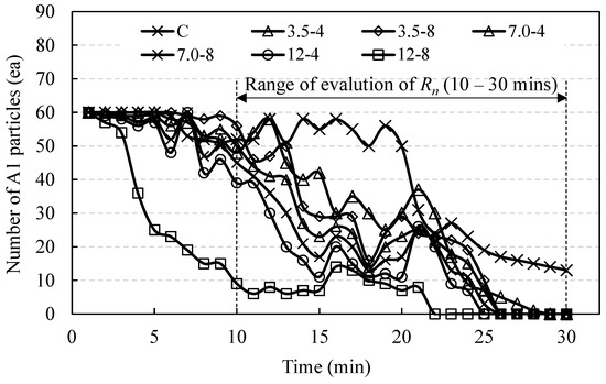 Figure 7 shows the number of A1 particles with respect to the time. The decrease in the number of A1 particles obtained from the chamber without a specimen was less than 17% in the first 20 min. The decrease dramatically increased after that. The decrease at 30 min was approximately 78%. The point in time at which the decrease began to increase dramatically and the decrease became more notable occurred earlier as the length and density of the textile fabrics increased. The number of A1 particles dramatically decreased at 12 min for the specimen with 3.5 mm length and 4 layers, and at 7 min for the specimen with 12 mm length and 4 layers.