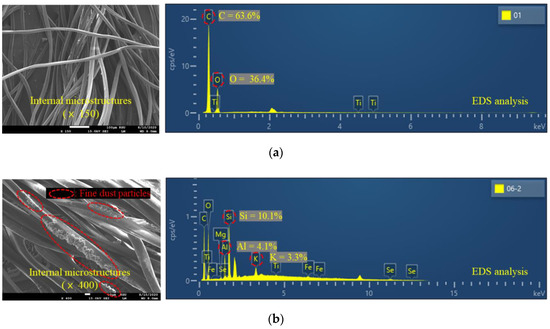 SEM images and EDS spectra of the uncoated textile fibers. (a) Before adsorption of the fine dust particles. (b) After adsorption of the fine dust particles.