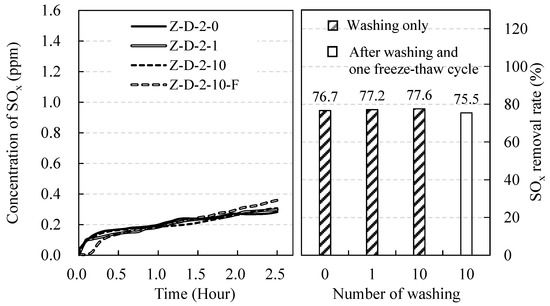 Figure 9 shows the SOx removal rate of the textile fibers coated with zeolite after exposure to the external environment. After one washing, the SOx removal rate dramatically decreased. The decrease was 52.5% at 2% epoxy content. The lowest SOx removal rate in the textile fibers using deionized water as the dilution solution was 34.9% at the epoxy content of 0%. The removal rate was 77.2% at the epoxy content of 2%, which was 2.2 times higher than that at the epoxy content of 0%. After 10 washings, the SOx removal rate of the coated textile fibers using deionized water as the dilution solution was 77.6% at 2% epoxy content. In addition, after 10 washings and a single freeze–thaw cycle. The removal rate was 75.5%, which was similar to that before exposure to the external environmental conditions of washing and freeze thawing. Meanwhile, the SOx removal rate of the coated textile fibers using isopropyl alcohol as the dilution solution after one washing exhibited similar trends to the removal rate using deionized water as the dilution solution. After one washing, the SOx removal rate of the coated textile fibers using isopropyl alcohol as the dilution solution was 26.6% at the epoxy content of 0%, and 62.4% at the epoxy content of 2%. This implies that a higher epoxy content is effective in maintaining a stable SOx removal rate in external environmental conditions such as washing or freeze thawing, because the epoxy directly affected the degree of adhesion between the textile fabrics and the zeolite.