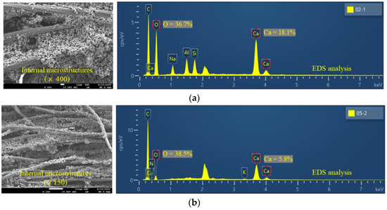 Figure 10 shows the SEM image and EDS spectra of the textile fabrics coated with zeolite. As shown in Figure 10a, before washing, O and Ca, which were the main components of zeolite, were present in the coated fabric in the proportions of 36.7% and 18.1%, respectively. After 10 washings and one freeze–thaw cycle, the proportions of O and Ca were 38.5% and 5.8%, respectively. This implies that the zeolite was well attached to the surface of the textile fabrics after exposure to external environmental condition such as washing or freeze thawing. The attachment of the zeolite to the fabrics was also confirmed in the SEM image in Figure 10b.