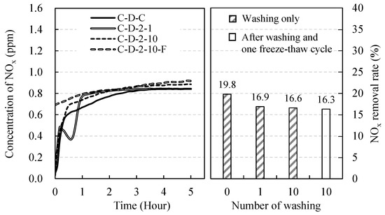 Based on the results obtained from Section 3.2 and Section 3.3, the textile fibers were coated with coconut shell activated carbon using 98% deionized water for the dilution solution and 2% epoxy. Figure 11 shows the NOx removal rate of the textile fibers coated with coconut shell activated carbon after exposure to external environmental conditions. The washing and freeze thawing procedures were identical to those in Section 3.3. Before washing, the NOx removal rate was 19.8%. This value was maintained after one and after 10 washings in which the removal rates were 16.9% and 16.6%, respectively. In particular, after 10 washings and one freeze–thaw cycle, the NOx removal rate was 16.3%, which was similar to that after one washing. This implies that the coating conditions of the solution type and epoxy content determined from the coating procedure of textile fibers with zeolite were effective in maintaining a stable NOx removal rate in textile fibers coated with coconut shell activated carbon in external environments.