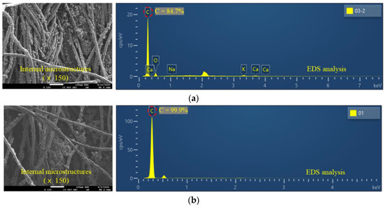 Figure 12 shows the SEM image and EDS spectra of the textile fibers coated with coconut shell activated carbon. As shown in Figure 12a, before washing, C, which is the main components of coconut shell activated carbon, was present at the proportion of 84.7%. After 10 washings and one freeze–thaw cycle, the proportion of C was 99.9%. This implies that the coconut shell activated carbon was well attached to the surface of the textile fabrics after exposure to external environmental conditions such as washing or freeze thawing. The attachment of the coconut shell activated carbon was also confirmed in the SEM image in Figure 12b.