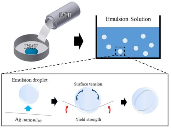 Ag nanowires with a length of 25 μm and a width of 30 nm dispersed in deionized (DI) water (0.1 wt%) were purchased (N&B Corporation, Ansan, Korea). N,N-Dimethylformamide (DMF), 1,2-Dichlorobenzene (DCB), NH3·H2O, and tetraethyl orthosilicate (TEOS) were purchased from Sigma-Aldrich (Seoul, Korea). For the DMF-based Ag nanowires, a centrifuge (1248, Labogene, Seoul, Korea) was used to separate Ag nanowire solution from water at 2000 rpm for 15 min. After removing water, the separated Ag nanowires were dispersed in DMF with 0.04 wt%. To formulate a water-in-oil emulsion, 200 μL of nanowire solution and 15 μL of NH3·H2O were mixed. Afterward, 5 mL of DCB were added to the mixture at a proper ratio followed by adding 15 μL of TEOS. Before heating the solution, a sonicator (Sonics VCX-500, Sonics & Materials Inc, Newtown, CT, USA) was utilized for a short time (<1 min) to prevent the droplets from recombining. The mixture was heated at 60 °C for 30 min to form the silica shells.