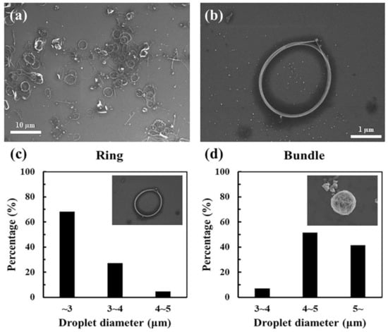 In order to make the Ag nanowire micro-ring structure, we employed an immiscible emulsion droplet formation method. Figure 1 shows that emulsion droplets could be continuously generated by tip sonication-induced vibration in DMF and DCB solution. During the process, Ag nanowires were captured in micro-scale bubbles (i.e., encapsulation) due to high surface tension force compared to the yield strength of Ag nanowires. We have previously shown that micro-rings are formed inside droplets by the force balance between the compressive force of the droplet and the restoring force of the high aspect ratio nanowire material []. Based on this mechanism, we investigated whether the micro-ring composed of Ag nanowire could be constructed in immiscible solution (Figure 2). The Ag nanowire micro-ring structure with a diameter in the sub-micron scale was successfully deposited on the substrate (Figure 2a,b). However, random generation of the emulsion droplets led to several entangled Ag nanowires in a single droplet. Figure 2c,d demonstrate that the entangled Ag nanowire micro-rings had a larger diameter (4–5 μm) compared to the single Ag nanowire micro-rings (<4 μm). This result led us to the next stage to sort the fabricated single and bundled Ag nanowire micro-rings with respect to droplet size using the PFF microchannel.