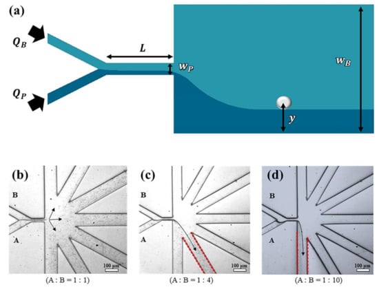 (a) A schematic of the pinched flow fractionation microchannel with a particle. Trajectory of 10 μm of hollow glass particles in different flow rate ratios of (b) 1:1, (c) 1:4, and (d) 1:10 (μL/min).