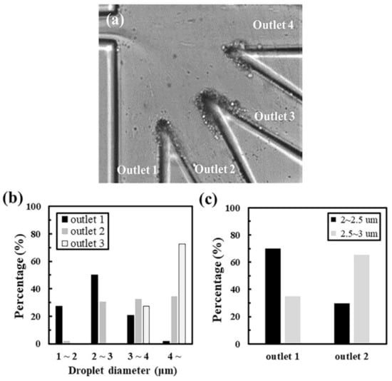 Microchannel design was taken from the multi-outlet microchannel developed in a previous study []. A microchannel was designed with a depth of 50 μm, inlet width of 60 μm, pinched channel width of 30 μm, and outlet width of 100 μm. A microchannel mold on a silicon wafer was constructed by deep reactive ion etching (DRIE). For microchannel fabrication, silane coating on the mold substrate was conducted in a vacuum chamber for 2 h. Trichloro (1 h, 1 h, 2 h, 2 h-perflurooctyl) silane (Sigma Aldrich, Seoul, Korea) was used for silane coating, and a sufficient amount of polydimethylsiloxane (PDMS) was poured on the mold substrate. The PDMS was placed in the vacuum chamber until most of the captured bubbles in the PDMS disappeared, and then baked at 120 °C for 2 h on a hotplate. The baked PDMS channel was detached from the substrate, punched through the inlet and outlet, and connected with a Teflon tube. To attach the PDMS channels to slide glasses, oxygen plasma coating was applied to each attachment surface. Lastly, the PMDS channel attached on the slide glass was heated at 80 °C for 30 min.