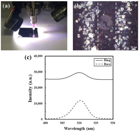 Experiments were carried out to make patterns through the electrohydrodynamic (EHD) jet printing process with the micro-ring dispersion ink (Figure 5a). First, we tried to print a line pattern containing the micro-rings through the dispensing method by heating the substrate to induce an evaporation rate of the toluene solvent. Figure 5b demonstrates the detailed pattern with the micro-ring array along the printing direction. Due to the coffee ring effect originating from the capillary flow induced by the differential evaporation rates across the drop [], the micro-rings were concentrated at the edge of the pattern.