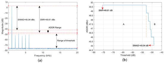 Figure 1a depicts that the range of the threshold is from the maximum of the harmonic, spurious components to the highest noise components. The ADDR of the DUT equals to the SINAD and the SNR when at its minimum and maximum, respectively.